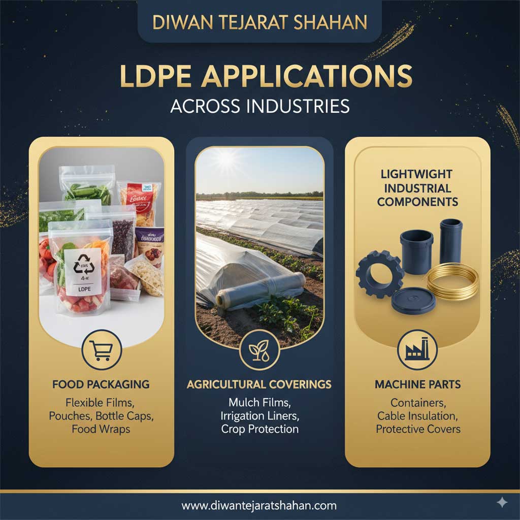 پلیاتیلن با چگالی پایین (LDPE) به دلیل انعطافپذیری، شفافیت و مقاومت نسبی، در بخشهای متنوع صنعتی و زندگی روزمره کاربرد دارد.