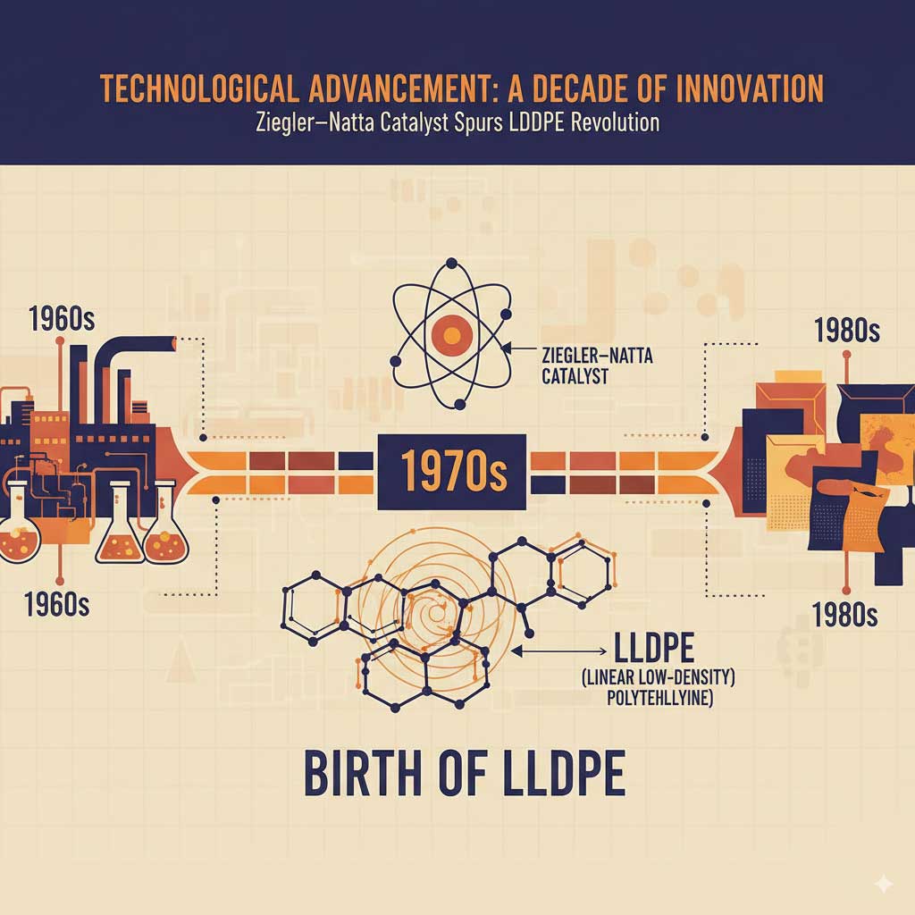 داستان شکلگیری LLDPE به دههی ۱۹۷۰ برمیگردد؛ زمانی که مهندسان شیمی به دنبال راهکاری برای تولید پلیاتیلنی با خواص مکانیکی بهتر از LDPE و ارزانتر از HDPE بودند. با توسعهی فناوری کاتالیستهای زیگلر–ناتا و متالوسن، دانشمندان توانستند نوع جدیدی از پلیاتیلن بسازند که ساختار زنجیرهای خطی اما انعطافپذیر داشت. این نوآوری به سرعت صنعت بستهبندی و کشاورزی را متحول کرد.